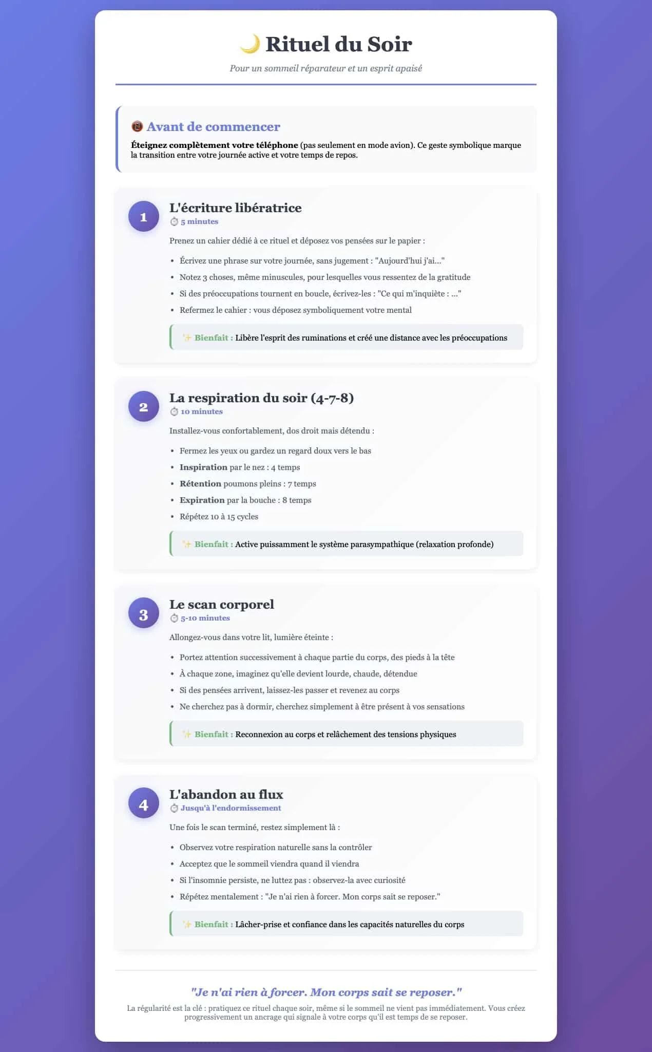 Q: Comment repérer le bon moment pour s’endormir ? R: Allez vous coucher dès que vous observez une légère baisse de l’attention (la « porte du sommeil »).